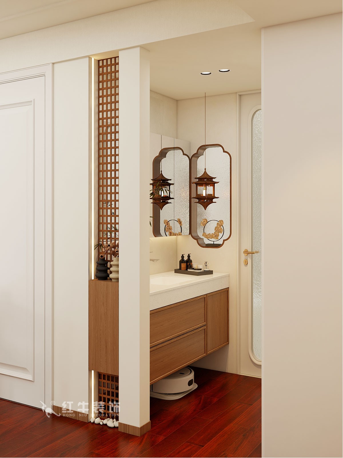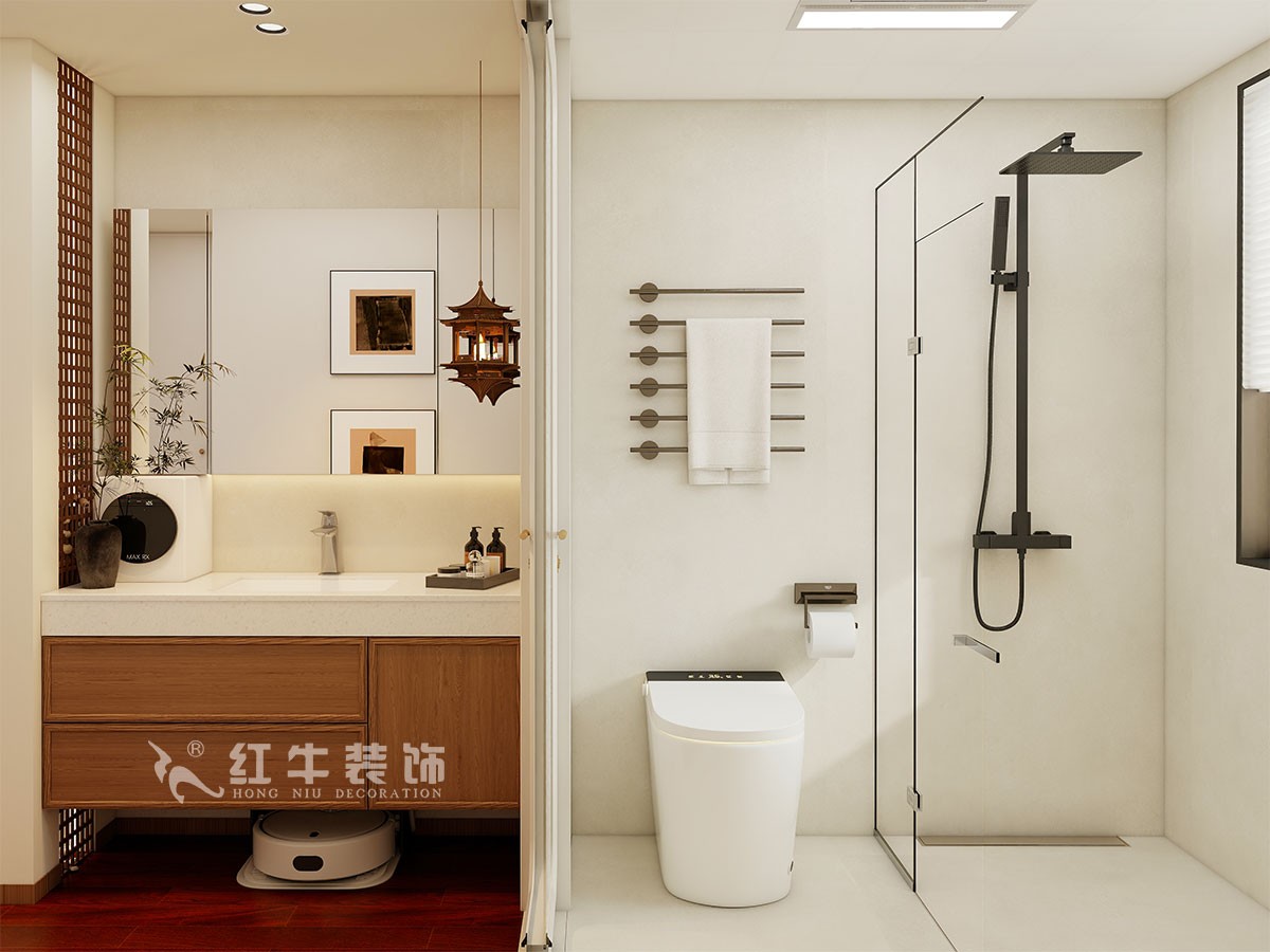 材質(zhì)運(yùn)用:全屋通鋪地板,保留自然質(zhì)感的同時(shí)提升耐用性;衛(wèi)生間采用木格柵與吊燈組合,凸顯復(fù)古趣味。