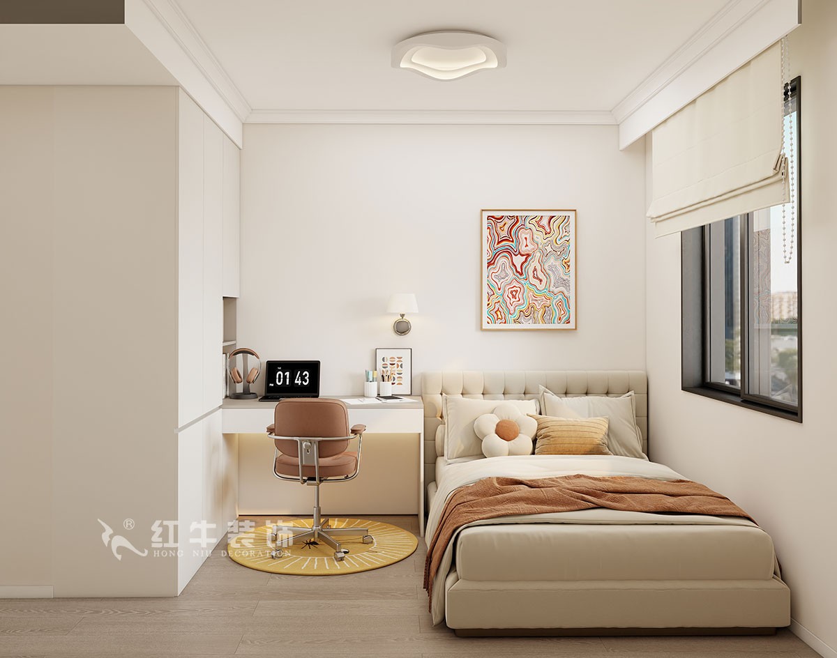 臥室說明:搭配大面積的白色定制衣柜,床頭的光源以不同形勢呈現(xiàn),既滿足不同燈光需求,又恰到好處地起到了裝飾效果,使整體臥室空間呈現(xiàn)明亮、溫柔的舒適狀態(tài)。