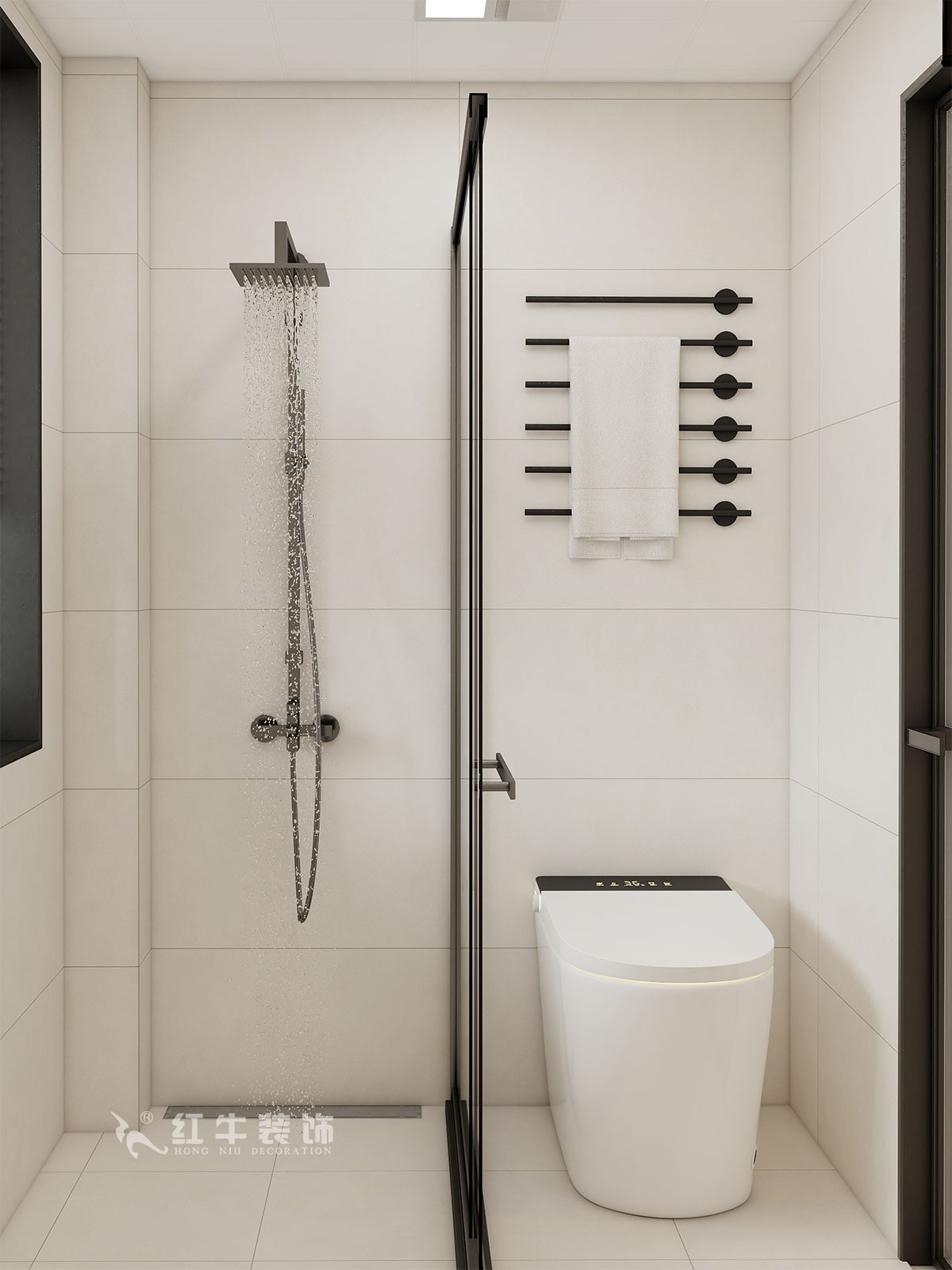 衛(wèi)生間說明:干區(qū)選擇整體色彩搭配干凈、大方,選擇大尺寸瓷磚上墻,高級感滿滿。