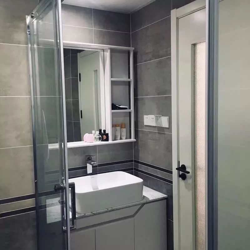 浴室柜選用了臺(tái)上盆,看上去簡潔大方。鏡子旁邊的收納柜能容納不少常用物品。