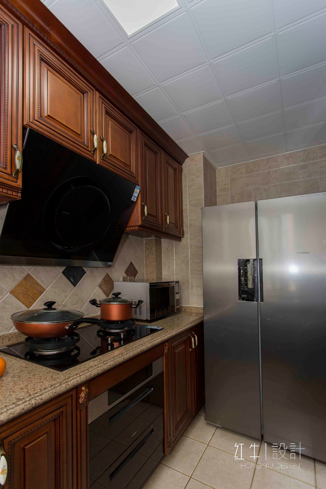 關(guān)注細(xì)節(jié)可以發(fā)現(xiàn),廚房柜門(mén)的把手都是復(fù)古樣式的。此外,墻磚采用斜鋪的方式,視覺(jué)效果很不錯(cuò),加上點(diǎn)綴了一些不同顏色的墻磚,趣味十足。