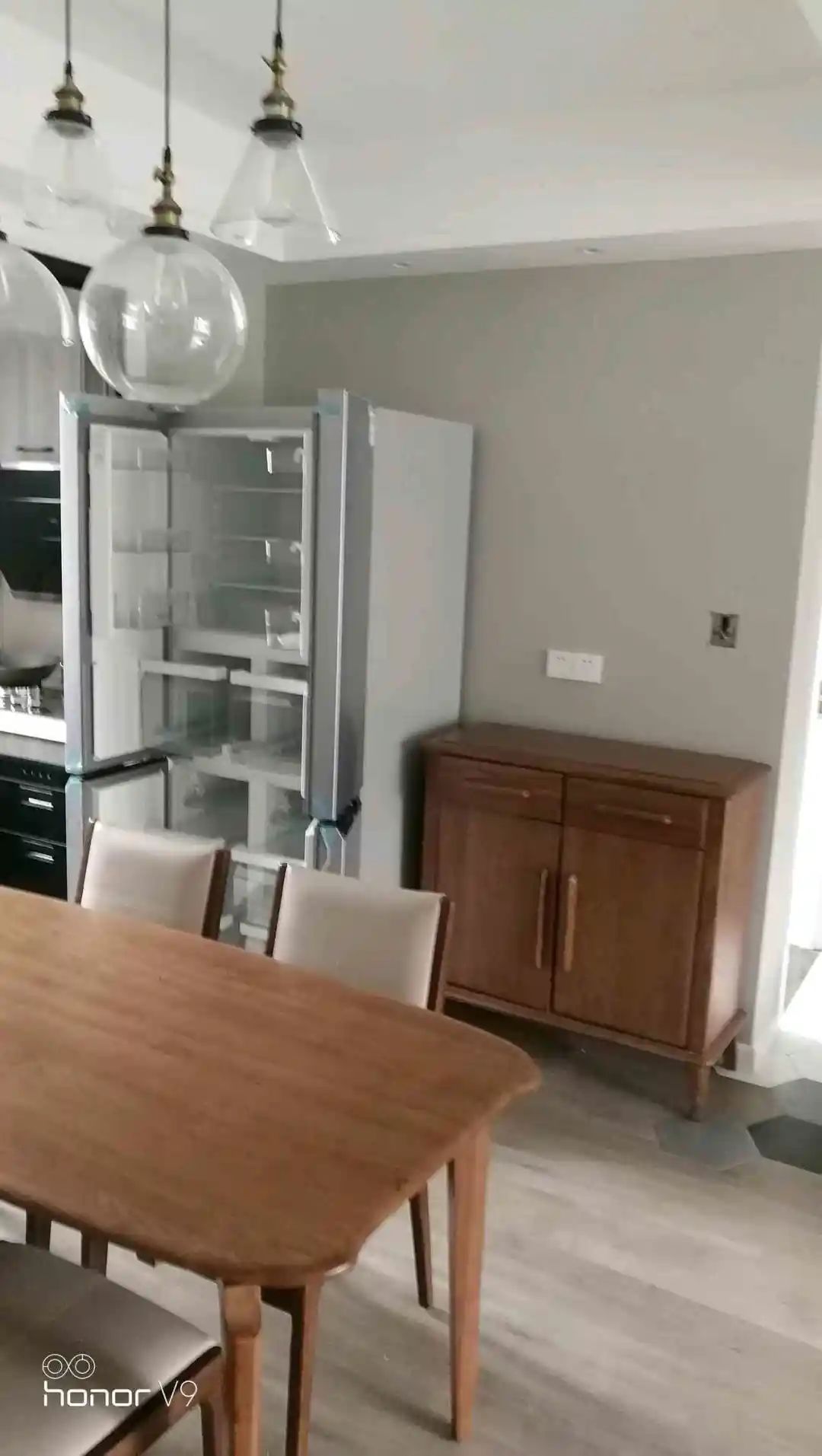 客餐廳通鋪木質(zhì)地板,觸感溫潤,自然美觀。雙開門冰箱放在餐廳角落,離餐桌和廚房都比較近,做飯或者拿飲料都比較方便。