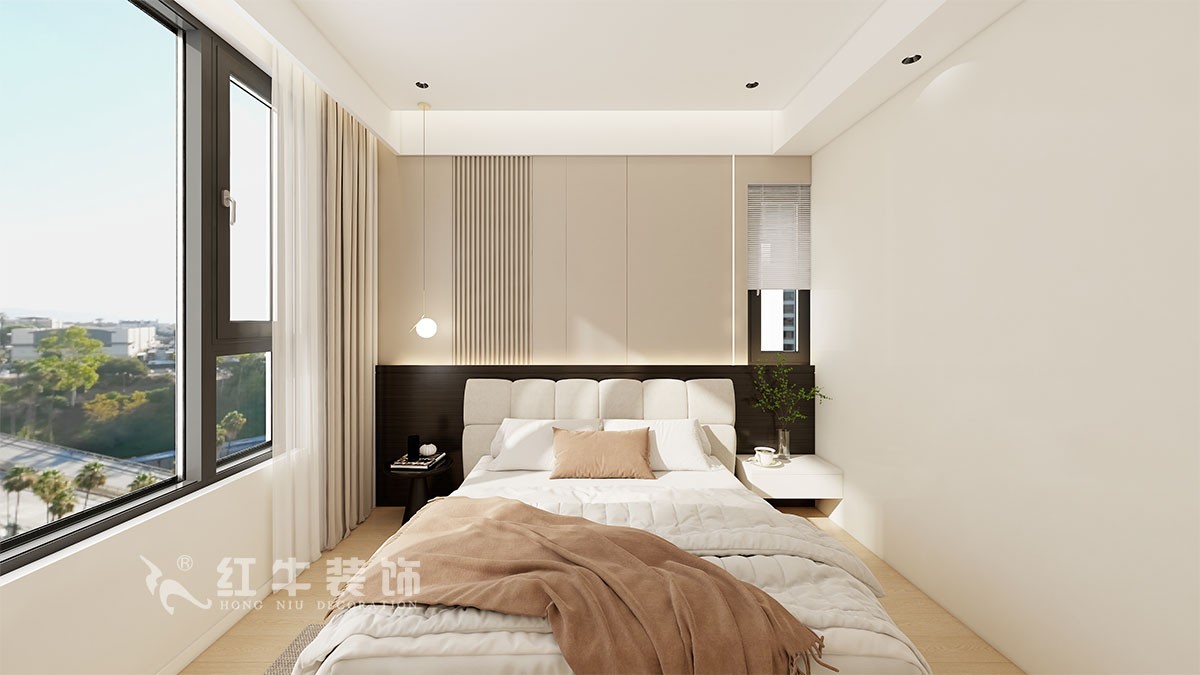 臥室低飽和度色系搭配原木色地板,簡約、個性的床頭背景,柔軟舒適的床品,透過紗窗充足的自然光,營造出一種溫暖寧靜的睡眠空間。